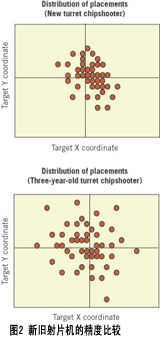 轉(zhuǎn)盤式射片機(jī)經(jīng)過較長時間的使用,由于零部件開始磨損,也會出現(xiàn)元器件拾取和貼裝精度問題。由于絲杠和凸輪表面開始磨合(或磨損),X-Y工作臺、轉(zhuǎn)盤貼裝頭、θ旋轉(zhuǎn)、帶盤絲杠之間的公差關(guān)系,基準(zhǔn)識別能力等等這些影響精度的因素相疊加,使得目標(biāo)貼裝或拾取點(diǎn)出現(xiàn)偏差。結(jié)果拾取和貼裝精度惡化(圖2)。這對于大的元器件可能不是什么問題,但當(dāng)貼裝0402、0201甚至01005無源元件時,它們就會帶來麻煩。