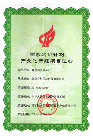 真空回流焊機(jī)V3取得2014年中國電子裝備工業(yè)設(shè)計(jì)紅帆獎(jiǎng)并取得國家火炬計(jì)劃示范項(xiàng)目證書。